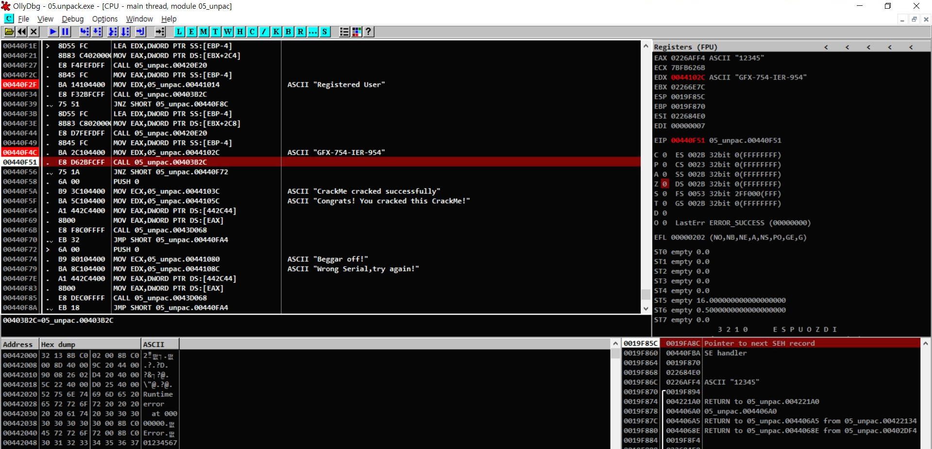 두번째 브레이크 포인트가 걸리고 EAX에 12345가 EDX에 GTX-754-IER-954가 들어가 있는 것을 볼 수 있다.