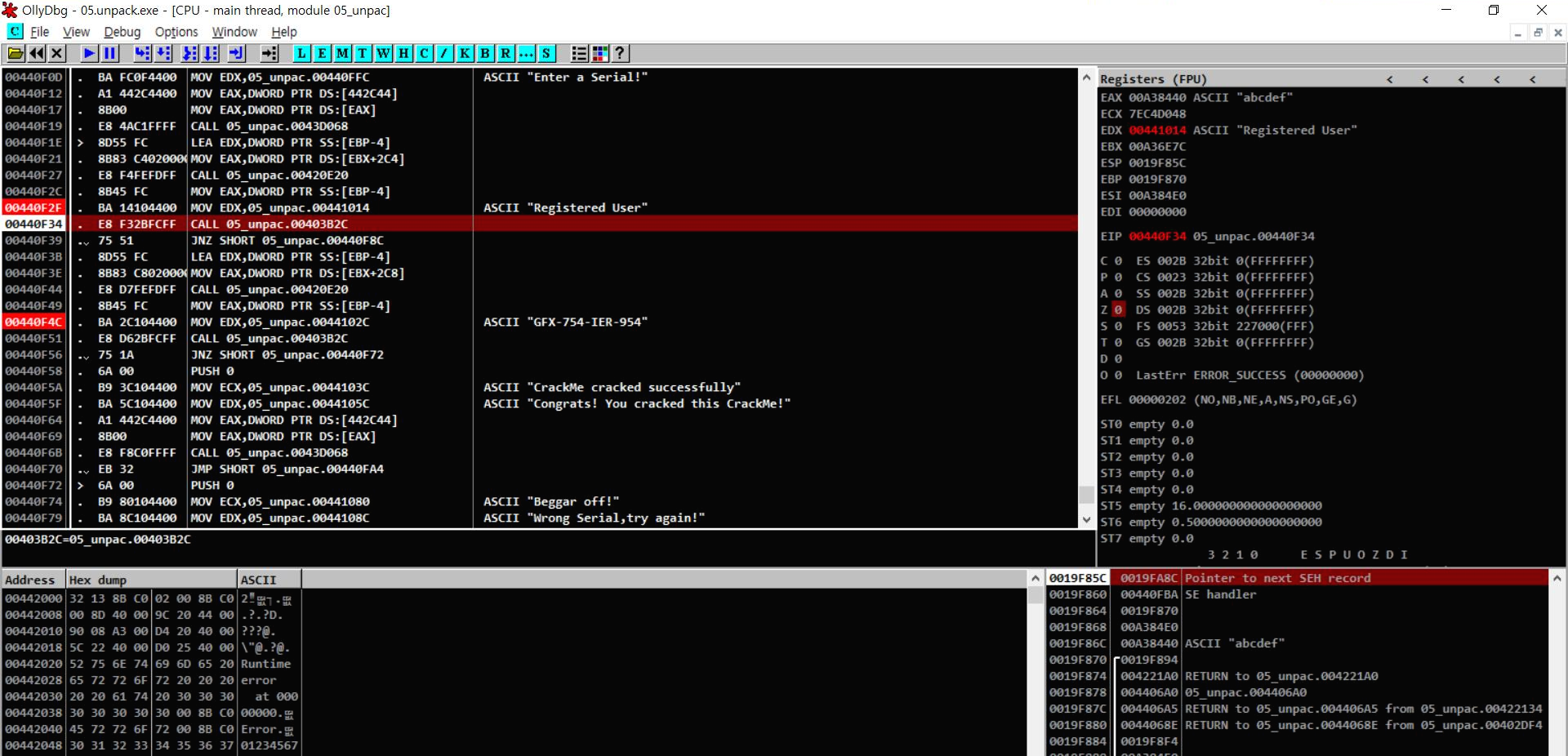 첫번째 브레이크 포인트가 걸리고 EAX에 내가 입력한 abcdef가 EDX에 Registerd User이 들어가 있는 것을 볼 수 있다.