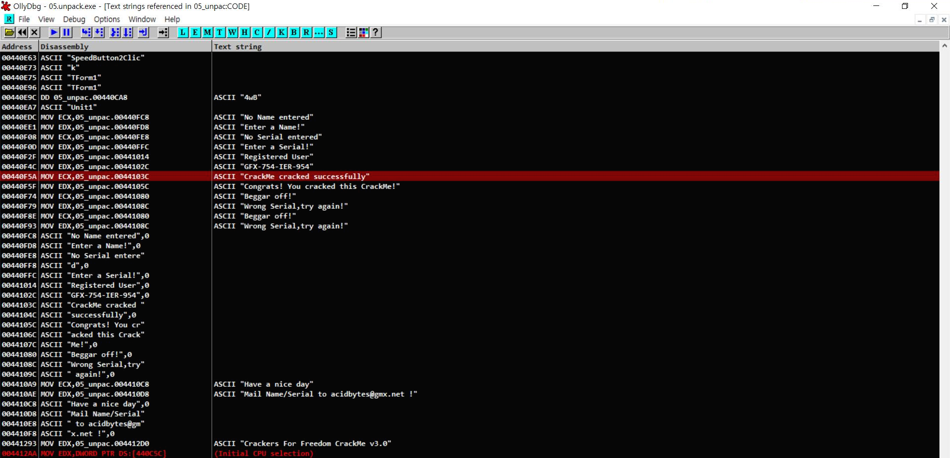 올리디버거로 언패킹된 프로그램을 열고 성공구문과 실패구문을 찾았다.