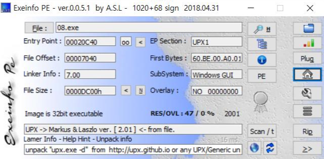 Exeinfo PE 프로그램으로 보니 UPX로 패킹되어 있는 것을 볼 수 있다.