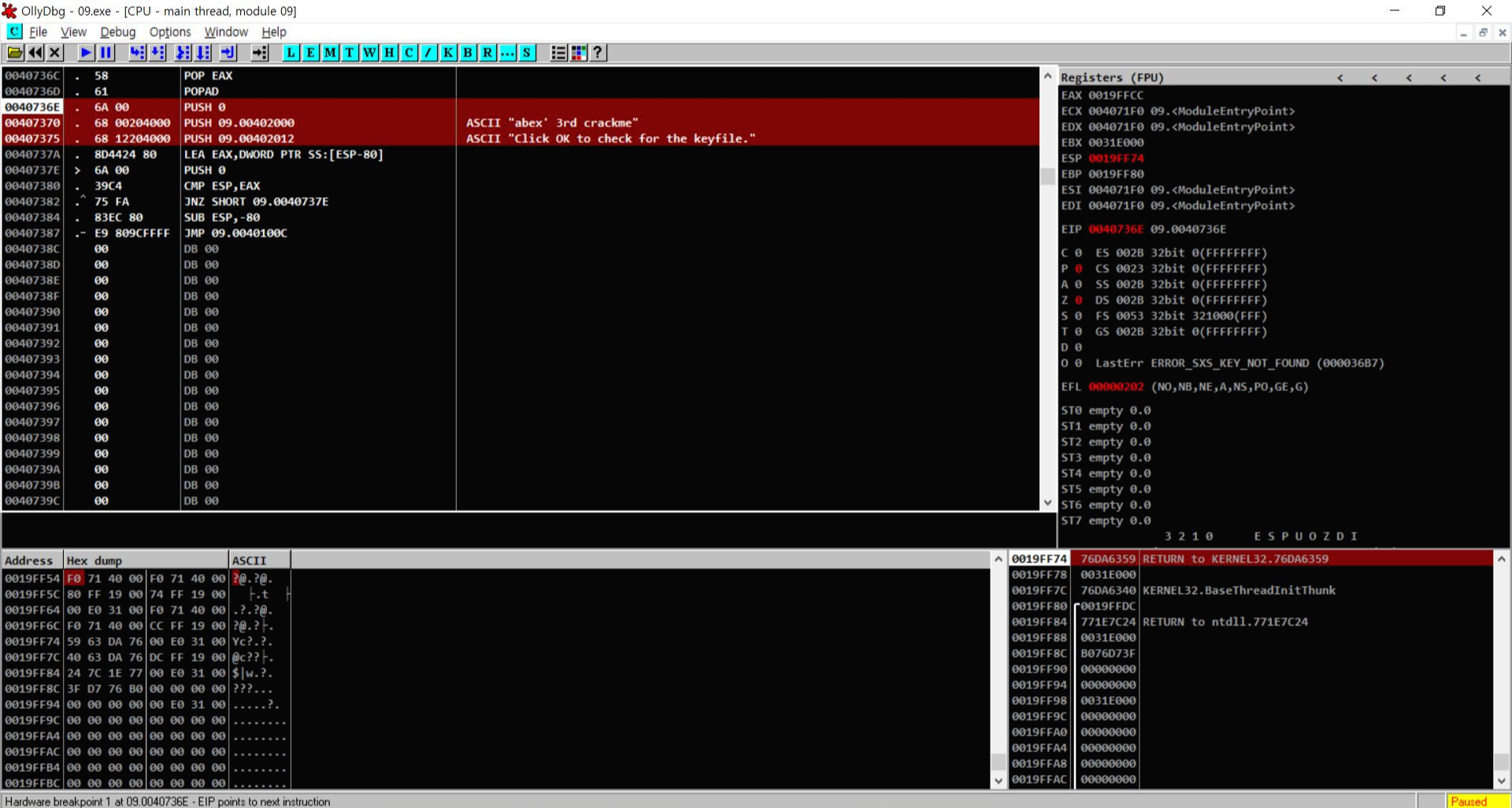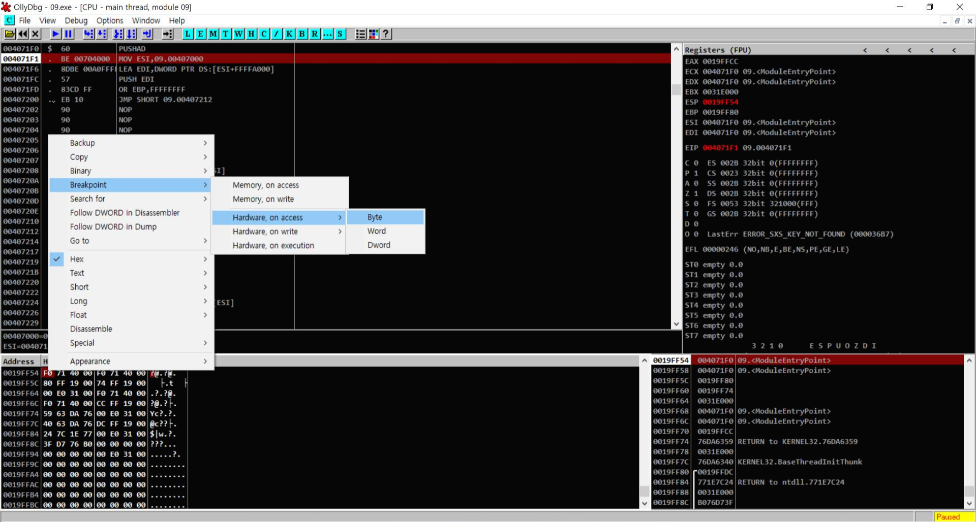 일단 PUSHAD를 실행 시키고 모든 레지스터 값이 stack에 저장되고 나중에 디코딩 후 프로그램이 정상적으로 실행되기 위해stack에 저장된 레지스터 값에 접근 할 때가 브레이크포인트를 걸어 OEP를 찾아내겠다.