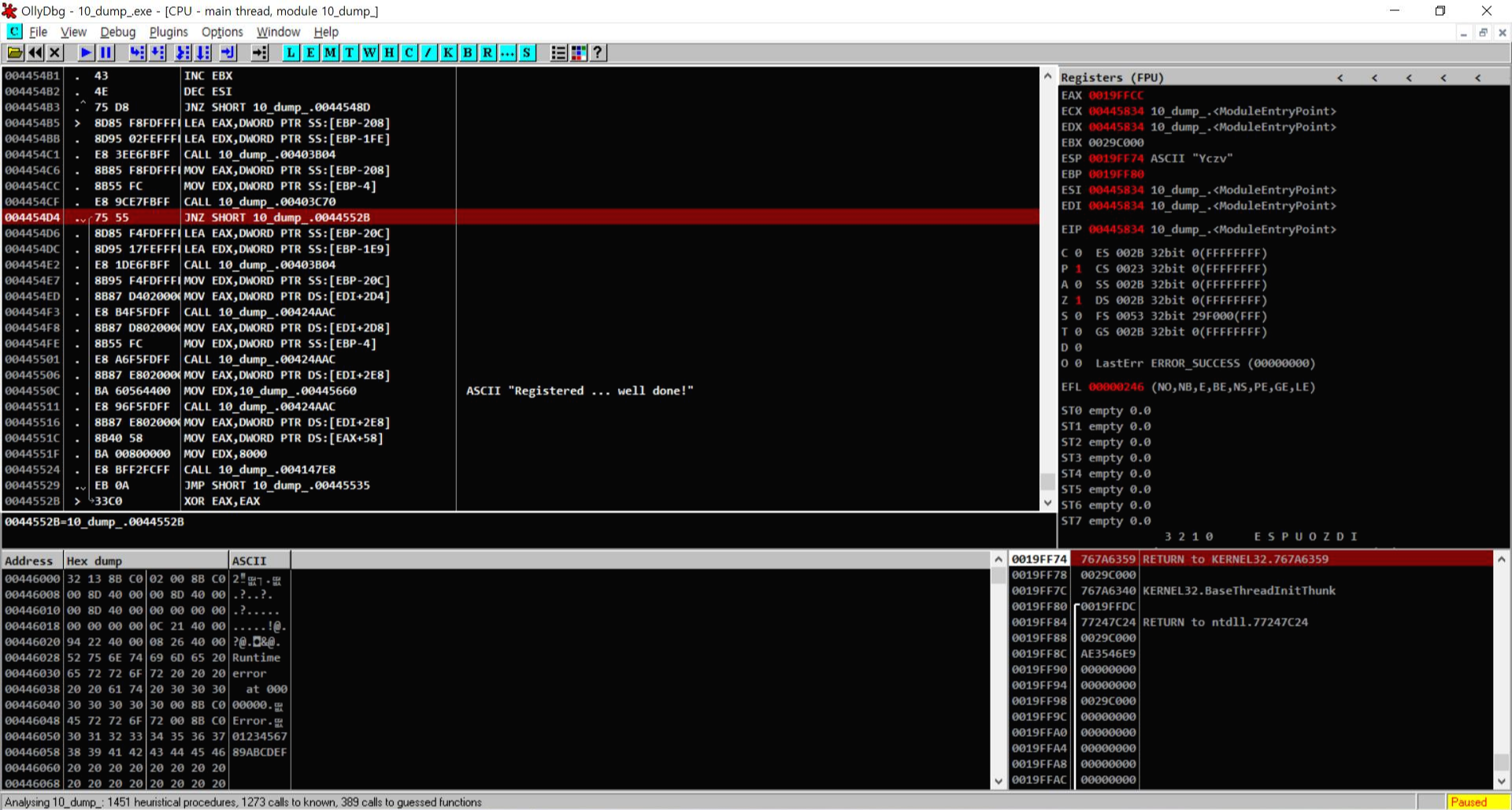 올리디버거로 열어서 Registered ... well done!이라는 성공구문을 찾았다.