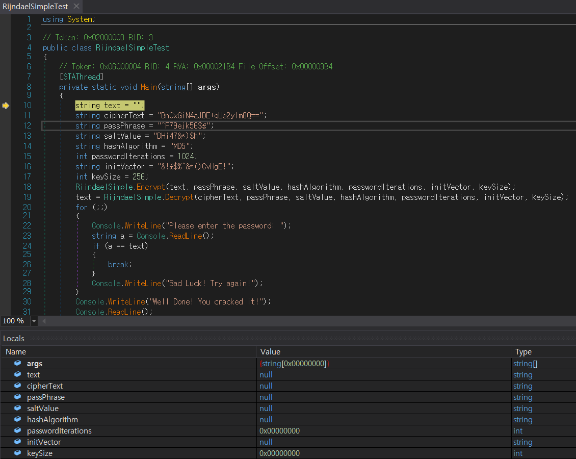 dnSpy에서 F5는 실행, F10은 한줄씩 실행이다.