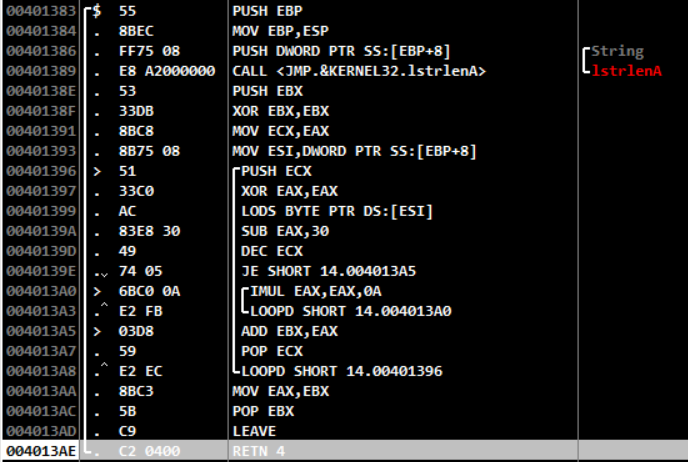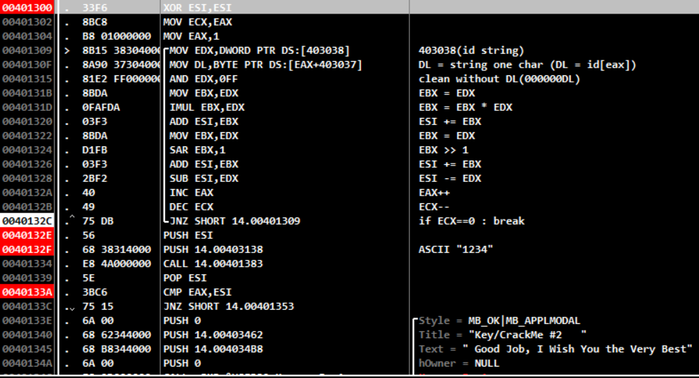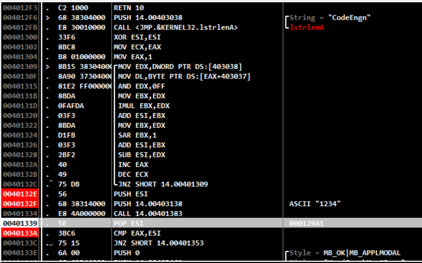 ESI가 반복문을 통해 값이 생성되고 0040132E에 스택에 넣는것을 볼 수 있다.