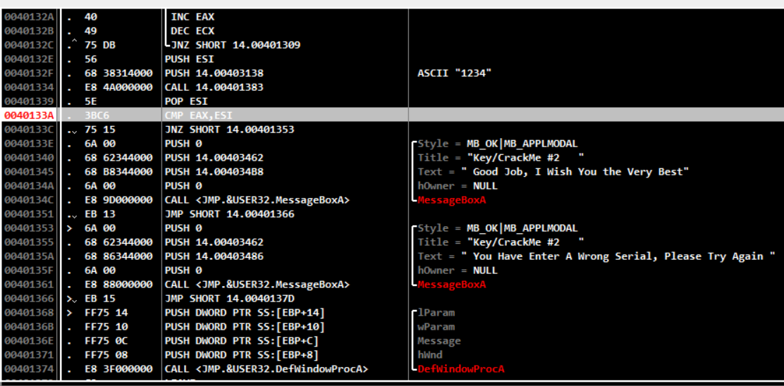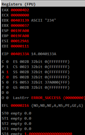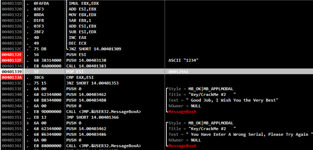 EAX에는 내가 serial로 넣은 0x1234가 있고, ESI에는 0x129A1이 있다.