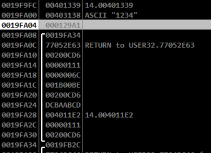 스택과 같이 보면 먼저 push esi를 해서 129A1이 스택에 들어갔고, 1234를 다시 스택에 넣고 call 00401383을 한것을 볼수 있다. call 00401383 실행되고 나서 esp는 다시 129A1을 가리키고 있다.