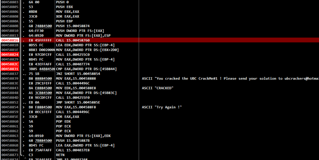 분기점에 브포를 걸어두겠다. EAX랑 *(45B844)를 비교하는 것을 볼 수 있다.