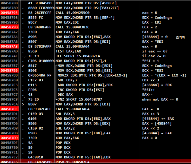 각 함수로 직접들어가기에는 오래 걸릴것 같아 대충 레지스터 바뀐것들만 봤다.