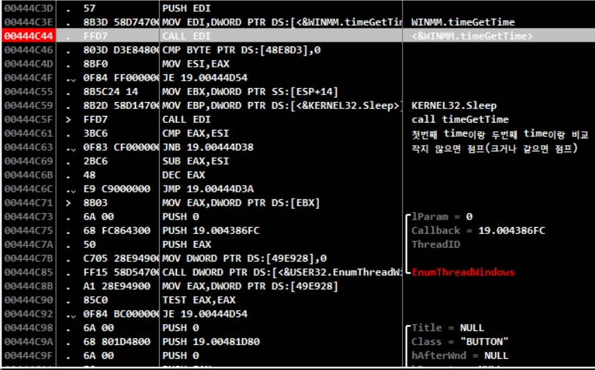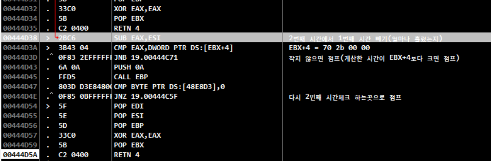 2번째 시간에서 1번째 시간을 빼 얼마나 흘렀는지를 EAX에 담고 그것을 EBX + 4 와 비교하는 것을 볼 수 있다.