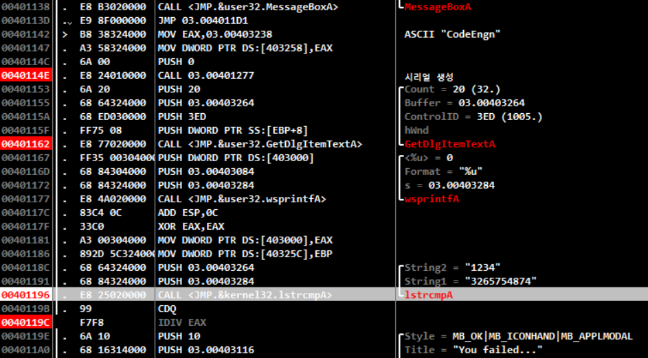 CodeEngn일때 serial 찾는거라 Name에 CodeEngn 넣으면되서 간단해보인다.