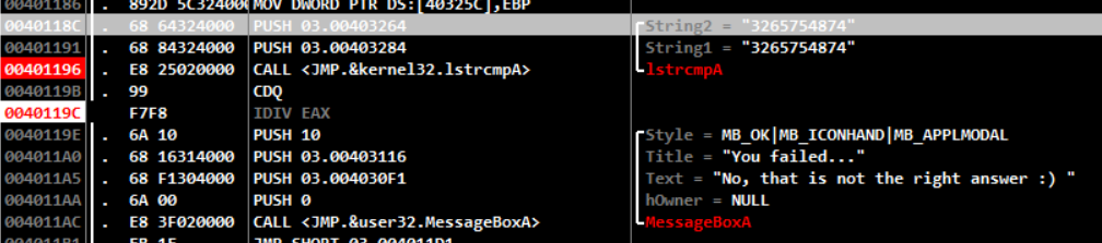 str1이 str2랑 같으면 eax값이 0이라 /0을 못해 멈춰버린다.