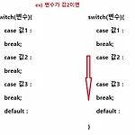 조건문 switch(){} switch()문은 if()문과 달리 true,false 뿐만 아니라 다른 경우의 수를 처리할 수 있다.특히, 메뉴를 만들때 유용하다.switch()문은 다음과 같이 사용한다.switch(변수){ case 값1 : break; case 값2 : break; case 값3 : break; default : } break는 반복문이나 조건문을 그만하고 싶을때 쓰는 것이다.default는 case문이 없을 경우 default로 이동한다. 보통 default는 switch에 마지막에 적어두므로 break를 굳이 사용하지 않아도 된다. switch()문의 실행과정은 변수의 값이 case로 정해준 값과 같으면 그 case로 이동한다.그리고 break문에 의해서 switch()문을 빠져 나..